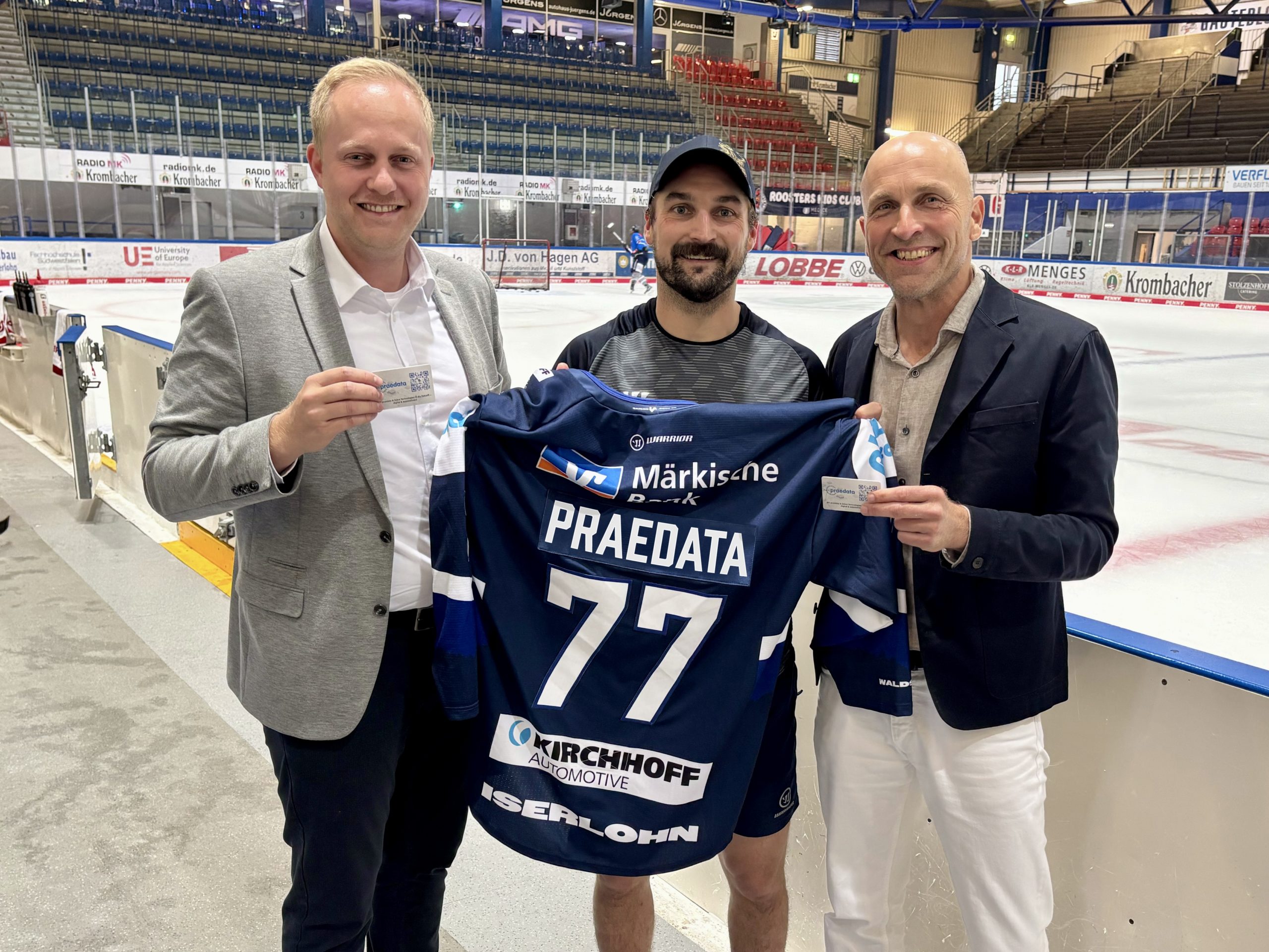 Das Unternehmen praedata aus Nachrodt-Wiblingwerde hat am vergangenen Freitag sein offizielles Sponsoren-Trikot der Iserlohn Roosters entgegengenommen. Verbunden war die Übergabe mit spannenden Einblicken ins Training der DEL-Mannschaft. Das Trikot trägt die Nummer 77 – ein klarer Verweis auf das Gründungsjahr 1977 und die enge Verbundenheit des Unternehmens mit der Region Südwestfalen.
