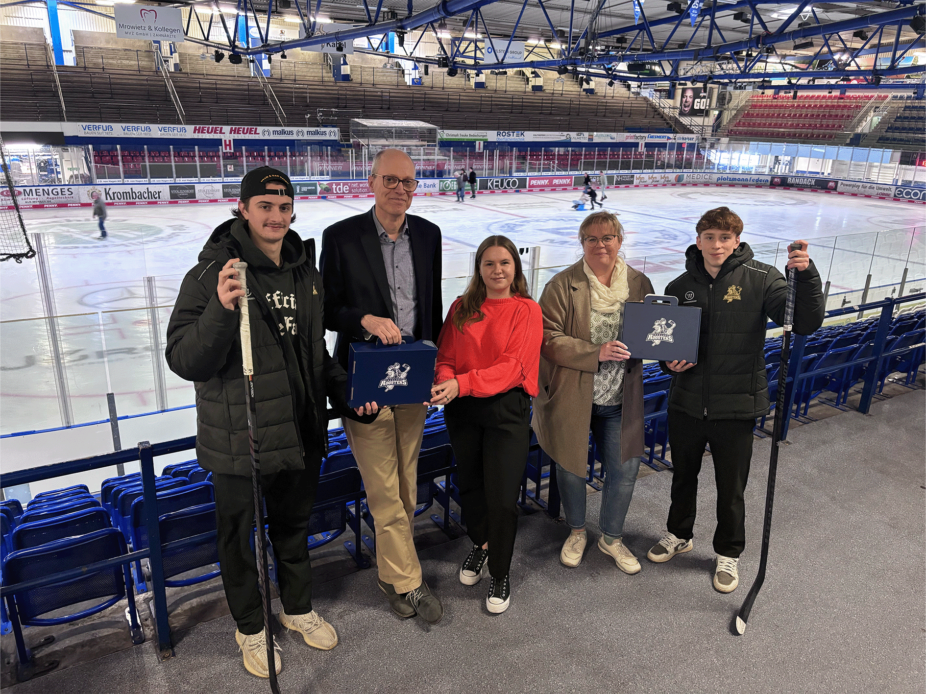 Stellvertretend für die zahlreichen MAV-Mitglieder, die Tickets geordert hatten, waren auch Mitarbeiterinnen eines Ausbildungsbetriebs bei der Übergabe vor Ort. Sonja Leisinger aus der Personalabteilung der HJS Emission Technology GmbH & Co. KG in Menden hatte die kaufmännische Auszubildende Anna Wallnisch mitgebracht. Beide nahmen gemeinsam mit Dr. Andreas Weber, Leiter Öffentlichkeitsarbeit & Bildung beim MAV, den Koffer mit den Tickets entgegen, der ihnen von Roosters Stürmer Taro Jentzsch und Young-Roosters-Talent Stanislaw Kronhardt übergeben wurde.
